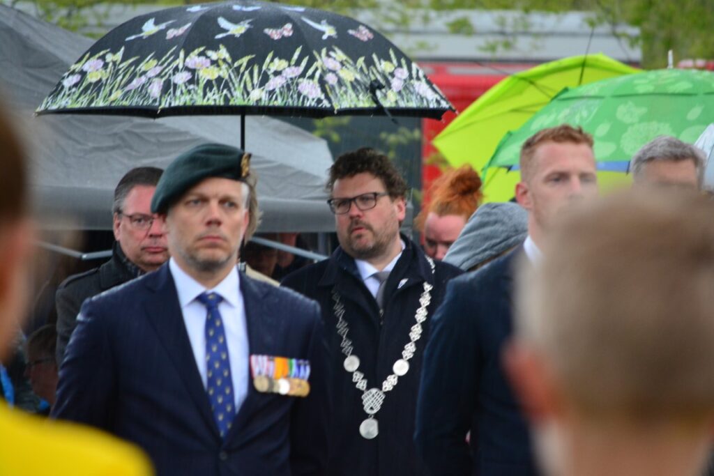Herdenking in kerkelijk centrum De Regenboog aan de Bovenweg. Aansluitend vertrekt de stoet, begeleid door een doedelzakspeler, naar het verzetsmonument bij het spoor. Ook hier zijn toespraken, muziek en bloemlegging.
