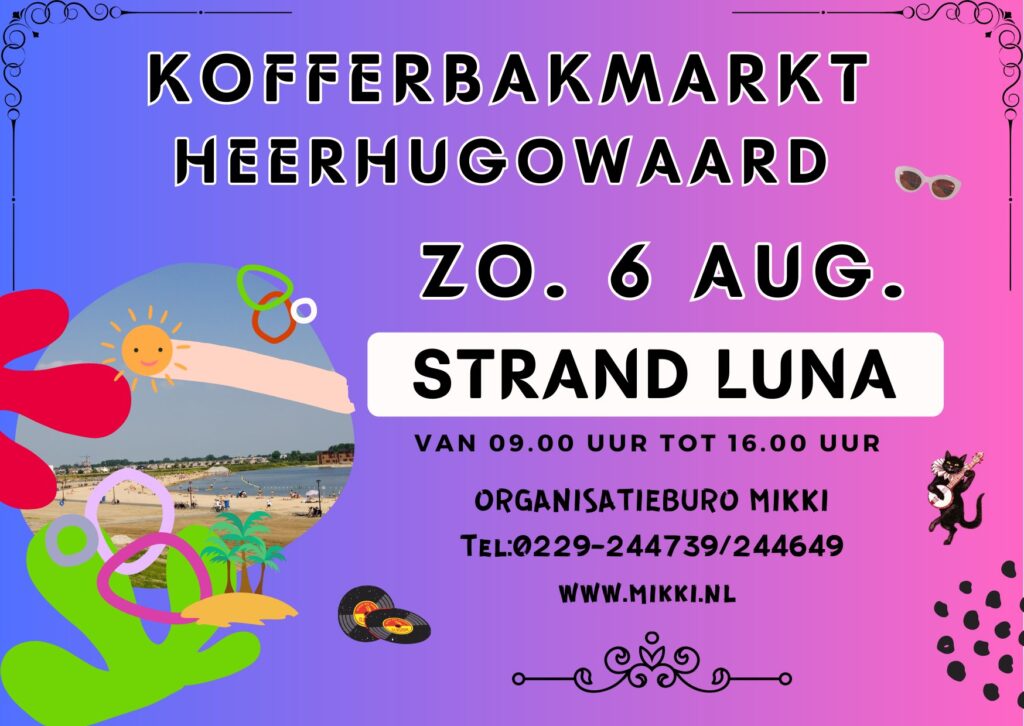 Komende zondag, 6 augustus, vindt de laatste kofferbakmarkt van dit seizoen plaats, georganiseerd door Organisatieburo Mikki. Het evenement wordt gehouden op het dagkampeerterrein bij het prachtige Strand van Luna in Heerhugowaard. Van 09.30 uur tot 16.00 uur ben je van harte welkom om langs te komen en te genieten van allerlei koopjes.
